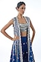 Featuring a blue jacket in tussar base with mirror work and hand embellishments. It is paired with an embellished blouse and flowy palazzo pants. Accentuate it with diamond jewellery and embellished heels for a festive occasion, wedding, sangeet or engagement ceremony.