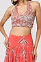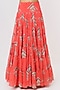 Featuring a coral flared skirt in georgette base with print. It is paired with a matching crepe blouse having thread and mirror embroidery.
