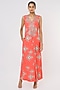 Featuring a coral jumpsuit in crepe base with geometric print, mirror and thread embroidery.