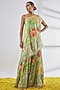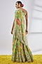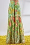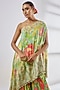 Gopi Vaid presents a green one-shoulder top in chiffon base with embroidery. It is paired with embroidered sharara pants. Accentuate it with kundan polki earrings and block heels for festive look.