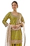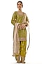 Featuring a green kurta in tussar base with embroidery. It is paired with salwar pants and a net dupatta having tikki embroidery. Accentuate with statement jewellery and juttis for a mehendi or festive ready look.