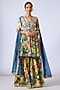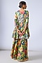 Featuring a green peplum top in chiffon base with floral print. It is paired with tussar printed sharara pants and a chiffon flowy dupatta. Complete your festive look with dangler earrings and elegant heels.