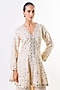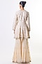 Featuring an ivory peplum-style kurta in tussar base with mirror embroidery. It is paired with chiffon tiered sharara pants having embellishment and ruffle detailing. Accentuate it with kundan or pearl drop earrings and embellished juttis or heels for an elegant look, perfect for festive gatherings, family functions or intimate wedding celebrations.