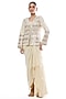 Featuring an ivory blazer in tussar base with mirror work and gold embroidery. It is paired with a mirror work blouse and a crepe draped skirt. Accentuate it with statement chandbali earrings and an embellished juttis for a refined ensemble, ideal for haldi ceremonies or festive occasions.