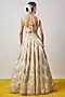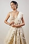 Featuring an ivory lehenga in tussar base with embellishments. It is paired with a tussar sleeveless blouse and an organza dupatta. Accentuate it with emerald jewellery and embellished heels for a wedding, sangeet or engagement ceremony.