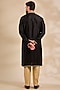 Featuring a black kurta in tussar silk base with marodi and gota embroidery. It is paired with gold beige cotton silk pants. Style it with mojaris for a festive occasion, cultural event, wedding or engagement ceremony.