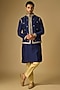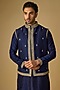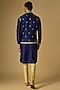 Featuring a navy blue bundi jacket in tussar silk base with marodi and gota embroidery. It is paired with a kurta and gold beige cotton silk pants. Style it with pair of mojaris for a festive occasion, wedding, engagement or sangeet ceremony.