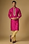 Featuring a rani pink kurta in tussar silk base with marodi and gota embroidery. It is paired with gold beige cotton silk pants. Style it with pair of kolhapuri sandals for a festive occasion, cultural event, wedding, engagement or sangeet ceremony.