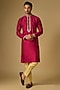 Featuring a red kurta in tussar silk base with marodi and gota embroidery. It is paired with gold beige cotton silk pants. Style it with pair of kolhapuri sandals for a festive occasion, cultural event, wedding, engagement or sangeet ceremony.