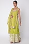 Featuring a lime green kurta in chanderi base with zardosi hand work and sequins embroidery. It is paired with matching sharara pants in tussar silk base and kota dupatta.
