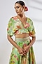 Gopi Vaid presents a mint green lehenga in organza base with floral print. It is paired with a chiffon embellished blouse having balloon sleeves. Accentuate it with kundan polki earrings and block heels for mehendi ceremonies.