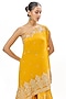 Featuring a mustard yellow one-shoulder draped kurta crafted in georgette, adorned with the ageless craftsmanship of intricate work and delicate embellishments. It is paired with tussar sharara. Style this designer draped kurta set look with chandbali earrings, chic potli, and mojaris for the perfect engagement or wedding outfit.