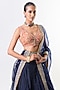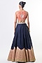 Featuring a navy lehenga in tussar base with embroidery. It is paired with a blouse having beadwork and a sheer organza embroidered dupatta. Accentuate it with statement kundan or polki jewellery, a sleek low bun or soft waves and embellished heels while draping the dupatta elegantly for a regal ensemble, ideal for weddings, sangeet or engagement ceremonies.