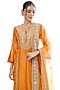 Featuring an orange kurta in tussar base with sequins butti and dori work. It is paired with cotton embroidered palazzo pants and an organza dupatta. Accentuate it with statement chandbali earrings and an embellished juttis for a refined ensemble, ideal for pre-wedding or festive occasions.