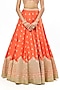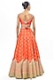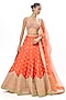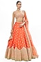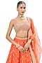 Featuring an orange voluminous lehenga crafted in tussar, adorned with the ageless craftsmanship of intricate embroidery and motifs. It is paired with an embroidered tussar blouse and an organza embellished dupatta. Style this designer lehenga set look with kundan jewellery, chic clutch, and wedges for the perfect engagement or wedding outfit.