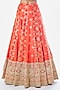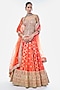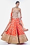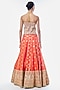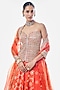 Featuring an orange lehenga in tussar base with embroidery. It is paired with an embellished strapless corset-style blouse and an organza dupatta. Accentuate it with statement jewellery, a low bun and heels for a cocktail, wedding, sangeet or engagement ceremony.
