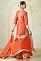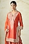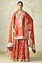 Featuring an orange straight kurta in tussar base with embroidery. It is paired with sharara pants and a sheer organza dupatta. Style it with polki earrings, block heels and an embellished clutch, perfect for diwali celebrations, weddings or engagement ceremonies.