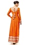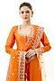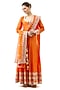 Gopi Vaid features an orange anarkali in tussar base with mirror embroidery. It is paired with linen satin palazzo pants and an organza dupatta having floral motifs embellishment. Accentuate it with mojaris and oxidised jhumkas for a haldi ceremony, festive pooja, or daytime wedding event.