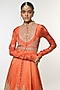 Featuring an orange jacket-style overlay in tussar base with embroidery. It is paired with an embellished blouse and an organza lehenga having diagonal stripe pattern. This regal lehenga, richly adorned with intricate embroidery, makes a perfect choice for wedding day or engagement ceremony.