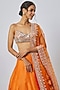 Featuring an orange lehenga in tussar base with mirror embellishments. It is paired with an embellished blouse and an organza embellished dupatta. Accentuate it with statement jewellery and heels for a bridesmaid look.