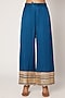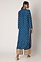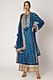 Featuring a peacock blue kurta in tussar silk base with mirror and thread work embroidery. It is paired with matching palazzo pants in linen satin base and a chiffon dupatta.