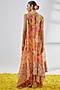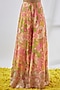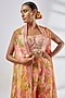 Gopi Vaid presents a pink cape in organza base with floral print. It is paired with floral printed chiffon pants and a chiffon blouse. Accentuate it with kundan polki earrings and block heels for sangeet ceremonies.