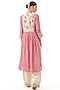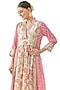 Featuring a pink anarkali in cotton silk base with floral print and motifs detailing. It is paired with linen satin palazzo pants. Accentuate with statement jewellery and heels for a sangeet or cocktail ceremony.