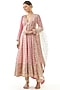 Featuring a pink anarkali in cotton silk base with a deep v-neckline, gota patti and thread embroidery. It is paired with lycra churidar pants and an embroidered net tikki dupatta. Accentuate it with silver jewellery and embellished heels for a festive occasion or sangeet ceremony.