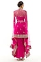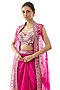 Featuring a pink cape-style jacket in organza base with mirror embellishments. It is paired with a tussar strapless blouse and a crepe draped skirt. Accentuate the designer lehenga set with statement jewellery and heels for your sangeet or engagement ceremony.