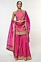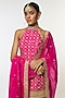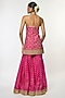 Featuring a pink halter-neck kurta in tussar base with embroidery. It is paired with embroidered sharara pants and a banarasi organza dupatta. Style this anarkali with chandbali earrings, juttis and a clutch for weddings, festive celebrations, and traditional family gatherings.