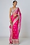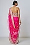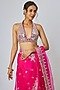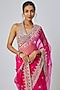 Featuring a pink saree in organza base with mirror work and floral motif embroidery. It is paired with a tussar blouse having a halter neckline and mirror embellishment. Accentuate with statement jewellery and heels for a festive occasion or sangeet ceremony.