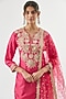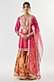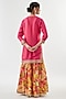 Featuring a pink kurta in tussar silk base. It is paired with floral printed satin sharara pants and a net tikki dupatta. Complete your festive or haldi look with dangler earrings and elegant heels.