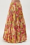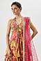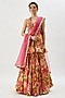 Featuring a pink peplum top in chiffon base with a halter-neckline and floral print. It is paired with a satin printed victorian style skirt and a net tikki dupatta. Complete your festive look with dangler earrings and elegant heels.