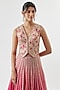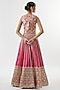 Featuring a pink flared skirt in tussar base with embroidery. It is paired with an embroidered blouse. Complete your festive or haldi look with dangler earrings and elegant heels.