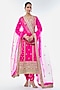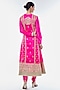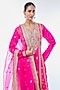 Featuring a pink kurta in tussar base with motifs embroidery. It is paired with churidar pants and a sheer organza dupatta. Accentuate it with dangler earrings and embellished heels for a festive occasion, wedding, sangeet or engagement ceremony.