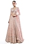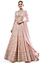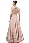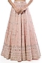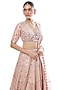 Featuring a pink lehenga in tussar base with thread work and embroidery. It is paired with a V-neck embroidered blouse and an organza dupatta. Accentuate it with statement chandbali earrings and embellished heels for a refined ensemble, ideal for sangeet ceremonies or weddings.