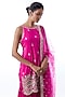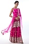Featuring a pink kurta in tussar base with mirror and threadwork. It is paired with embroidered sharara pants and a net dupatta. Accentuate it with diamond jewellery and embellished heels for a festive occasion, wedding, sangeet or engagement ceremony.
