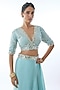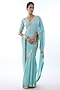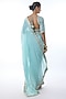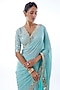 Featuring a powder blue saree in chiffon base with embroidery. It is paired with a tussar blouse having sequins embroidery. Accentuate it with diamond jewellery and heels for a festive occasion, wedding, sangeet or engagement ceremony.