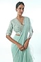 Featuring a powder blue saree in chiffon and organza base with ruffle detail. It is paired with a tussar blouse having mirror embellishment. Accentuate it with diamond jewellery and heels for a festive occasion, wedding, sangeet or engagement ceremony.