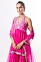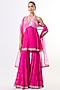 Featuring a rani pink peplum kurta in tussar base with a halter neckline and mirror embroidery. It is paired with chiffon tiered sharara pants having mirror embellishments and a net dupatta having sequins border. Accentuate it with kundan or pearl drop earrings and embellished juttis or heels for an elegant look, perfect for festive gatherings, family functions or intimate wedding celebrations.