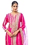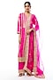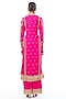 Featuring a rani pink straight kurta in tussar base with embellishments. It is paired with linen satin palazzo pants and an organza dupatta. Accentuate it with kundan polki jewellery and block heels for a wedding or sangeet ceremony.