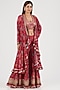 Featuring a red frilled cape in chiffon base with floral print. It is paired with matching cotton silk blouse and sharara pants having gota embroidery.