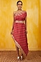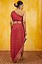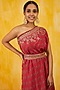 Featuring a red one-shoulder dress in crepe base with floral print and an embroidered belt.