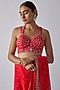 Featuring a red badla saree in georgette base with zardosi border. It is paired with a tussar hand embroidered strap blouse. Accentuate it with statement jewellery and heels for a wedding, sangeet or engagement ceremony.