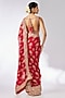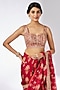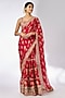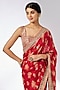 Gopi Vaid features a red frilled saree in organza base with hand and machine embroidered border and floral jaal detail. It is paired with a cotton silk sleeveless printed blouse. Accentuate it with statement earrings and heels for festive occasions or weddings.