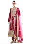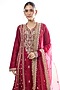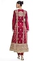Featuring a red anarkali in tussar base with motifs embroidery. It is paired with brocade churidar pants and an organza dupatta. Accentuate it with statement chandbali earrings and an embellished juttis for a refined ensemble, ideal for sangeet ceremonies or festive occasions.