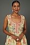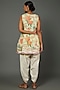Featuring a yellow peplum top in viscose base with floral print. It is paired with contrasting cotton dhoti pants.
