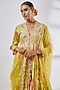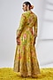 Gopi Vaid presents a yellow anarkali in chiffon base with floral print. It is paired with linen satin palazzo pants and a net dupatta. Accentuate it with kundan polki earrings and block heels for haldi ceremonies.