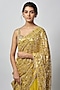 Featuring a yellow saree in organza and chiffon base with mirror embroidery. It is paired with a tussar embroidered blouse having a scoop neckline. Accentuate it with statement jewellery and heels for a festive look.
