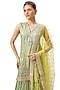 Featuring a yellow sleeveless kurta in cotton silk base with embroidery. It is paired with cotton silk embroidered flared sharara pants and a net embroidered dupatta. Accentuate the designer sharara with polki jewellery, embellished heels and a potli bag for a wedding or haldi ceremony.